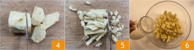 In the meantime, work on the gnocchi: take the stale bread, from which you have removed the crust, and cut it first into slices 4 and then into cubes 5. Transfer the bread cubes into a bowl and soak them with milk 6.