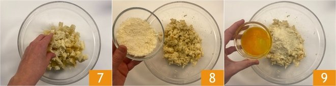 Crumble the soaked bread with your fingertips 7; if the bread is very dry, you may need to let it rest for about fifteen minutes, working it from time to time to fully crumble it. Add the grated Grana Padano PDO 8 and eggs 9.