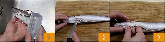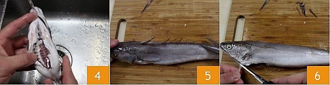Then rinse the inside of the fish well under running water to remove any residue and blood 4, then place it again on a cutting board and trim the dorsal fins with scissors 5, cut the lateral fins 6 and those at the end of the belly.