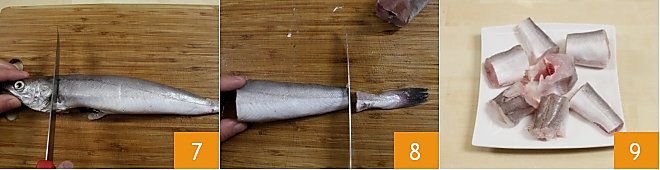 Now cut the head just below the gills and the tail to remove these parts (7-8), then cut the body of the cod into pieces and place them on a plate 9.