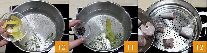 Prepare the steamer for steaming: fill it halfway with water, and when it's heated, add the thyme sprigs, the untreated lemon zest, and peppercorns (10-11). Once the water boils, place the steamer basket on top, and when it's well heated, add the cod pieces inside 12 (if you don't have a steamer, you can use a large pot and an aluminum colander).