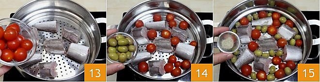 Also add the previously washed cherry tomatoes 13 and green olives 14 into the basket. Season to taste with salt and ground white pepper 15.