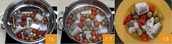 Cover the cod pieces with a lid to favor steam cooking and let cook for about 5-6 minutes or until the flesh becomes white and tender (16-17). Then turn off the heat and carefully remove the basket to plate your cod with cherry tomatoes and green olives and serve hot 18!