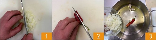 To prepare stewed cod with potatoes, first clean the onion and chop it finely 1, then slit the chili pepper lengthwise 2. In a saucepan, heat a splash of oil with the chili pepper and crushed garlic cloves, then add the chopped onion 3 and sauté for a few minutes.