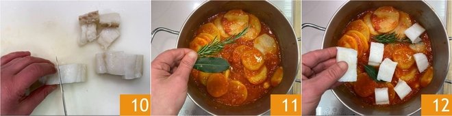 In the meantime, cut the cod fillet into pieces 10, after removing the skin and any bones. After 10 minutes, add the rosemary and bay leaf 11, then place the pieces of cod inside 12.