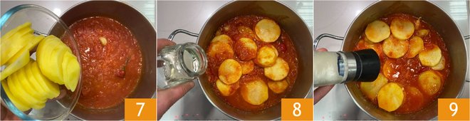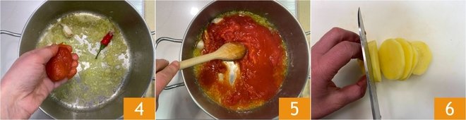 When the onion becomes translucent, add the peeled tomatoes, crushing them with your hands 4, and cook over low heat for about ten minutes 5. Meanwhile, peel the potatoes and cut them into 0.4-inch slices 6.