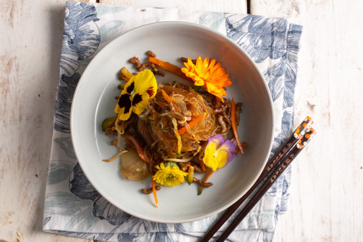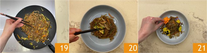 Stir-fry one last time 19, serve the soy spaghetti 20 garnishing the plates with edible flowers 21.