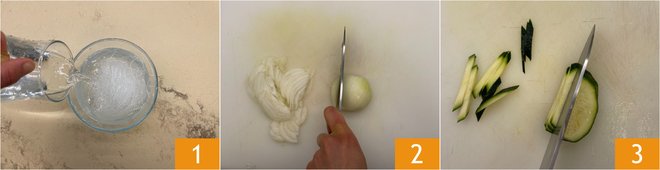 To prepare the stir-fried soy spaghetti, soak the spaghetti in lukewarm water for 30 minutes, or better yet, leave them in cold water overnight 1. Clean and slice the onion 2, cut the zucchini into sticks 3.