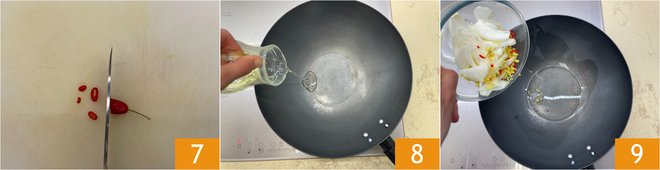 Cut the chili pepper into strips 7. Pour a dash of oil into the wok 8, add the onions, ginger, and chili pepper 9. Let them wilt for a few minutes.