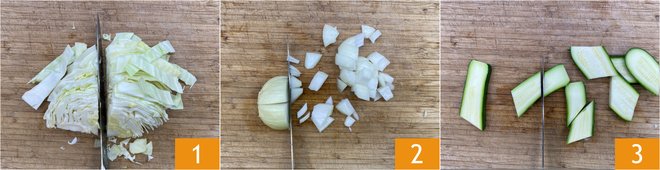 To prepare the stir-fried vegetables with soy sauce and ginger, first, wash the vegetables and cut them into strips, starting with the cabbage, removing its inner core 1. Clean and slice the onion 2. Trim and cut the zucchini into irregular pieces, about 1/8 inch thick 3.
