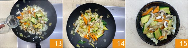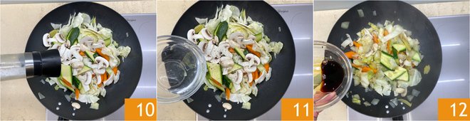 Salt 10 and pepper 11, pour a little water 11, and stir-fry for about 8 minutes. Stir often to avoid burning. When the vegetables and mushrooms are cooked, add the soy sauce 12.
