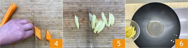 Peel and trim the carrots, slicing them to the same thickness as the zucchini 4. Clean and slice the ginger as well 5. In the wok, heat the vegetable oil, then add the ginger 6.