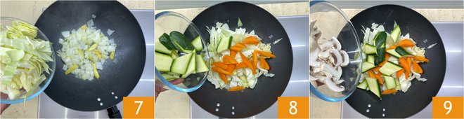 Add the onions and let them simmer over low heat, then add the other vegetables: the cabbage 7, the carrots, the zucchini 8, and the cleaned mushrooms 9.