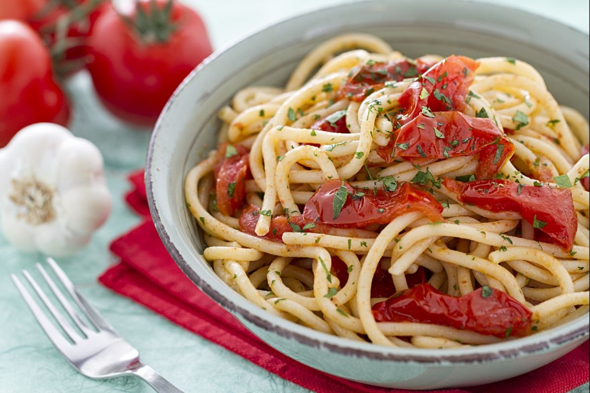 Strangozzi alla Spoletina is really simple to prepare: just a few steps to achieve great homemade fresh pasta, dressed with a simple tomato sauce and a generous sprinkle of freshly chopped parsley.