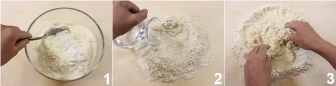 To make Strangozzi alla Spoletina, start by preparing the pasta: place the all-purpose flour and semolina flour in a bowl, mix well 1, and transfer everything to a pastry board. Make a classic well in the center, add the water, a little at a time 2, and start kneading 3.