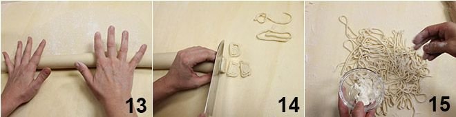 and roll it up on itself 13. Cut the obtained roll into slices about 3/8 inch thick 14, which you will open and separate to obtain long “flattened spaghetti.” Lightly flour the strangozzi obtained 15