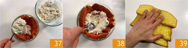 Now pour the ricotta cream in the center 37 pressing well with the back of a spoon 38. Cover the filling with more slices of sponge cake 39.