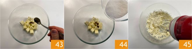 Meanwhile, prepare the soft tart that will be the cake base: in a bowl, pour the butter and vanilla extract 43. Add the sugar 44 and beat the mixture with electric beaters 45.