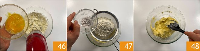 Incorporate the eggs, one at a time 46, and finally sift the flour and baking powder 47, also add the salt and mix well 48.