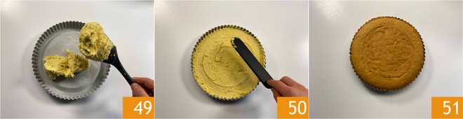 Pour the mixture into a 8.7-inch (22 cm) diameter greased and floured smart cake pan 49, level the surface well with a spatula 50, and bake in a preheated static oven at 356°F (180°C) for about 25 minutes. Remove the soft tart from the oven and let it cool 51.