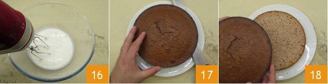 Whip the fresh cream with a mixer, using refrigerated beaters and bowl if possible 16. Now that the cake is cold, you can cut it in half 17 18.