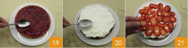 Cover the base with strawberry jam 19, whipped cream 20 and strawberry slices 21.