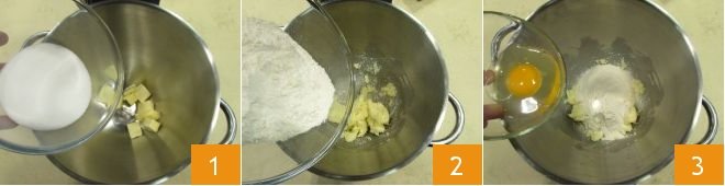 To prepare the strawberry curd tart, first start with the Shortcrust pastry. Take a stand mixer, add the refrigerator-cold butter with the sugar 1. Mix the ingredients to combine them evenly with the paddle attachment. Then add flour 2 and egg 3.