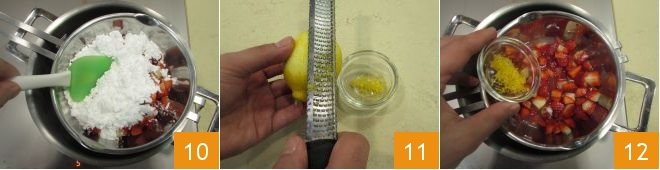 Using a spatula to mix the ingredients well 10 and let the strawberries cook for 5 minutes. Then take an untreated lemon and grate the zest 11. Now add the lemon zest to the strawberry curd 12 and let it cook for another 20 minutes.