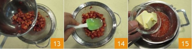 At this point, take the strawberries and strain them into a bowl with a fine-mesh sieve 13. Then, using a spatula, press them 14 to filter not only the juice but also as much pulp as possible. Move the filtered strawberry pulp back into the bain-marie and add butter 15.