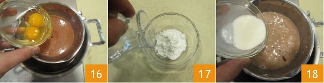 Now add the eggs 16. Continue to mix the ingredients well with a spatula to create a smooth mixture without lumps. In a separate small bowl, add cornstarch and dissolve it with a splash of room temperature water 17 stirring with a kitchen spoon. Then pour it into the strawberry curd in the bain-marie 18 and mix the ingredients well with a hand whisk.
