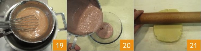 Continue cooking in the bain-marie for another 5 minutes, stirring the ingredients well with the hand whisk 19. Then transfer the curd into a small bowl and let it cool for about 20 minutes at room temperature 20. Then return to the pastry preparation. Roll out the pastry that you left to rest in the fridge on a work surface. Lightly flour the work surface to prevent the pastry from sticking, then roll it out 21 until it’s about 1/5 inch thick.