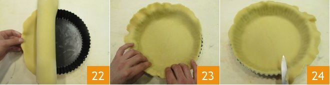 Now butter a 9-inch tart pan and use the rolling pin to lift the rolled-out pastry and place it in the tart pan 22, ensuring it adheres well to the edges by pressing lightly with your fingers 23. Then remove the excess dough protruding from the edges of the tart pan using a small knife 24.