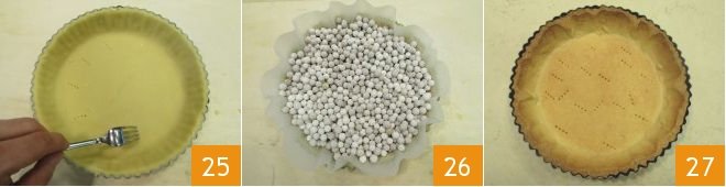 Then, using a fork, prick the bottom of the tart 25. Cut a 11-inch circle of parchment paper and place it on the pastry where you will place ceramic baking beads (or beans) to allow blind baking (you can also consult the guide on How to do blind baking for more detail) 26. Bake the tart in a preheated static oven at 365°F for 20 minutes (or fan-forced at 330°F for 10 minutes). Once baked, remove the ceramic beads and parchment paper. Then bake again for an additional 10 minutes, so you can see the bottom of the tart become golden 27. The base for your strawberry curd tart pastry is now ready.