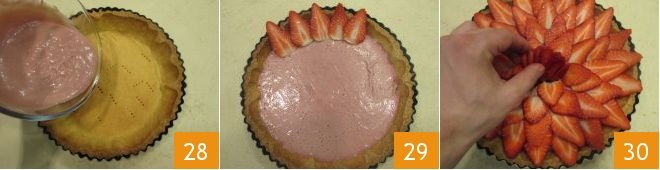 When the curd has cooled, pour it into the tart 28. Place the tart filled with the curd to rest in the refrigerator for at least 30 minutes (if you notice the curd doesn’t set, extend the resting time in the refrigerator - this could take up to 2 hours). This step is necessary to let the curd set before proceeding with the decoration. Once the curd is set, arrange the sliced strawberries in a radial pattern 29 until the entire surface of the tart is filled 30.