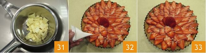 To complete the decoration, chop the white chocolate and melt it in a bain-marie 31, stirring well with a spatula. Then transfer it to a paper cone for decoration and decorate the surface by drawing some lines of white chocolate over the tart 32. Your strawberry curd tart is now ready to be served and enjoyed 33!