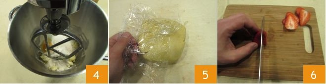 Continue mixing using the paddle attachment 4 and when the dough is smooth and well combined, transfer it to a work surface and shape it into a loaf. Cover it with clear plastic wrap 5 and place it in the refrigerator to rest for at least 30 minutes. In the meantime, prepare the strawberries. Rinse the strawberries under running water, remove the green stem, and cut 250g into slices about 1/8 inch thick 6. Set them aside in a small bowl, as they will be used for the final decoration.