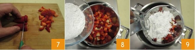 Then roughly chop the remaining 500g 7 and place them in a saucepan, in a bain-marie over another larger saucepan 8. Add powdered sugar and room temperature water 9.