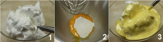 To prepare the strawberry delights, whip the egg whites (which should be at room temperature) with a mixer, and when they start to turn white, add one-third of 150 g of sugar, let it whip for a minute, then add another third of the sugar, and the final third after another minute 1. Whip the egg yolks with the other half of the sugar for at least 7-8 minutes 2; when both mixtures are ready, gently mix them together in a large bowl with care not to deflate them 3.
