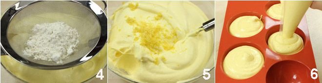 Add the sifted flour into the bowl 4 and the zest of a Sorrento lemon 5, place the mixture into a pastry bag and then squeeze it into semi-sphere molds with a diameter of 3 inches 6.