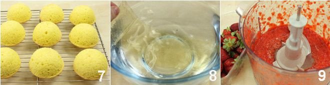 Bake in a preheated static oven at 356°F for about 20 minutes, then remove the semi-spheres, let them cool slightly, extract them from the molds, and let them cool completely on a wire rack 7. Soak the gelatin sheets in a bowl of cold water for at least 10-15 minutes 8. Prepare the strawberry cream by blending the strawberries 9 and straining them: you should obtain about 7 oz of strawberry puree.