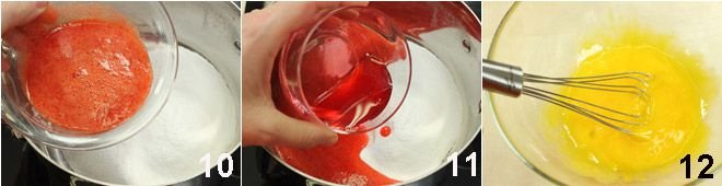 Place the sugar, strawberry puree 10, and syrup 11 (or strawberry liqueur if you prefer) in a saucepan and dissolve the sugar over low heat. Beat the egg yolks with a whisk 12 to break them.