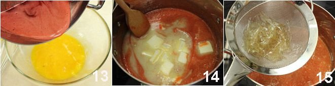 and then pour the strawberry syrup over them, beating constantly 13; place everything in a saucepan, bring to a boil, then add the butter in pieces 14, stir for 2 minutes, then add the well-drained gelatin sheets 15, stir for a few seconds, and remove from heat.