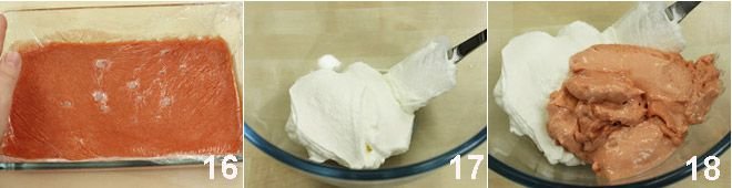 Pour the obtained cream into a wide and shallow bowl, cover it with plastic wrap directly on the cream: place it in the refrigerator to cool 16. If the cream is too firm when removed from the fridge, blend it with a mixer to make it smooth and soft again. Whip the cream 17 and fold it into the strawberry cream 18: if there are lumps, strain everything through a sieve (do not worry, the cream will remain light, dense, and consistent) pressing down with a silicone spatula.