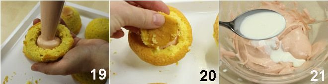 Prepare the syrup to soak the delights by dissolving the sugar with water over heat and adding the chosen essence or liqueur to this syrup; let the syrup cool. Hollow out the delights in the center, lightly soak them with the syrup, and fill the cavities with strawberry cream 18, then plug the hole with a slice of sponge cake 20 taken from the base of the plug removed from each and place them on a wire rack. Thin the remaining cream with a few tablespoons of liquid cream or milk 21