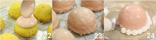 and cover the spheres 22, letting the excess cream drip 23. At this point, decorate the strawberry delight with tufts of whipped cream 24 and wild strawberries as desired. Place the strawberry delights in the fridge until ready to serve.