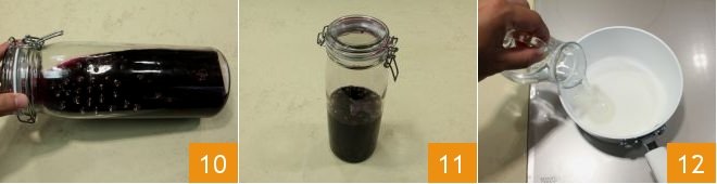 boil for 2 minutes 13 and then turn off the heat, allowing the syrup to cool. Meanwhile, strain the contents of the glass jar through a fine-mesh sieve 14, pressing the strawberry grapes well to extract all the juice 15;