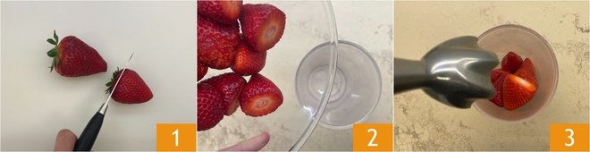 To make the strawberry madeleines, first wash the strawberries and remove the hull 1, then transfer them to a pitcher 2 and blend with an immersion blender 3.