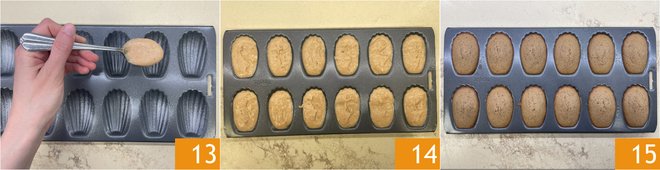 After this time, butter the madeleine mold and fill each cavity with a scant tablespoon of batter 13. Bake in a preheated static oven at 392°F (200°C) for about 12 minutes 14. Once cooked, remove the mold from the oven 15.