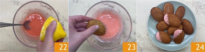 Finally, add the lemon juice 22 and mix again. Dip one end of the madeleines into the glaze 23 and let them dry at room temperature. Your strawberry madeleines are ready to be served 24!