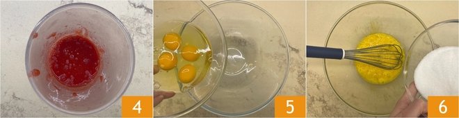 After preparing the strawberry puree 4, melt the butter in a saucepan and let it cool slightly. In a separate bowl, pour the eggs 5 and beat them together with the sugar without whipping them 6.